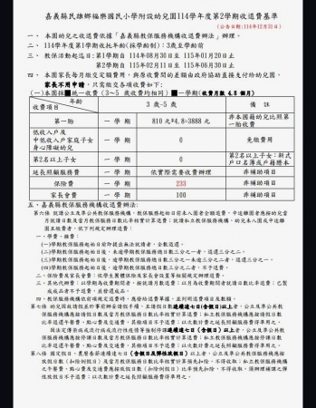 嘉義縣福樂附幼114年度第二學期收退費基準