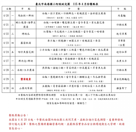 另原菜單4/29早點肉絲蛋炒飯調整成蟹黃燒賣,請家長以此份餐點為主,謝謝您的體諒與配合!