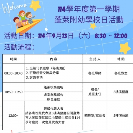 您好!為了加強親師之間的溝通,推動學校與家長成為親密教育夥伴關係,共同擔負起孩子的學習指導責任,我們將在9月13日(星期六)上午八時三十分舉辦本學期「學校日」活動。在活動中有校務經營方針的說明,也提供家長與教師共同分享教育理念、教學重點、評量方式、班級經營,以及討論班親會組成、班級各項活動安排等溝通時間。您的參與將促成孩子在社交、情感、學業及生活上的成長,誠摯的邀請您務必撥冗參加,謝謝!