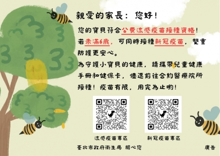 自114年10月1日起可接種公費流感及新冠疫苗,請家長攜帶健保卡至臺北市立聯合醫院附設院外門診部或本市流感及新冠疫苗合約醫療院所完成接種。