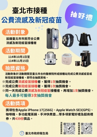 台北市「公費流感及新冠疫苗健康抽好禮」活動說明: