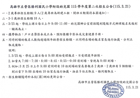 勝利國小附設幼兒園 地址:高雄市左營區新下里27鄰南屏路1號 電話:(07)5522541#700