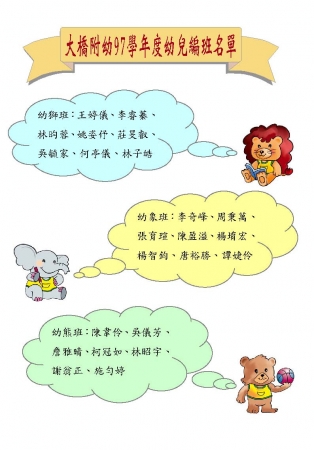 大橋國小附設幼稚園 地址:臺北市大同區重慶北路三段二號 電話:(02)2591-8904分機10.11.12